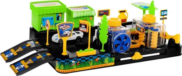 2 Autos, große Basis, Verkehrszeichen, bewegliches Band, Kammer mit rotierenden Bürsten, Trockenkammer, bewegliche Schranke, 2 Unterführungen/Rampen, Dekorationen (Bäumchen, Blumentöpfe, Markt/Restaurant, Tankstelle)