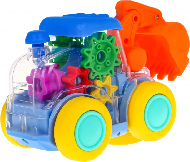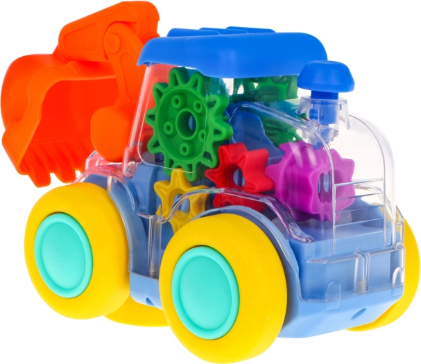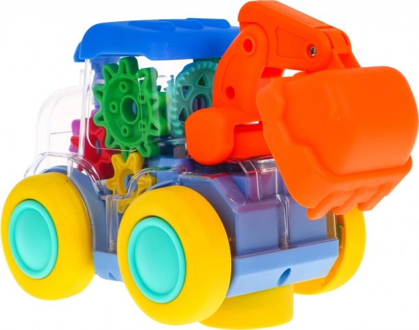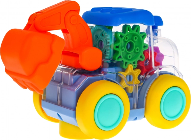 Im Inneren des Baggers sind Zahnräder sichtbar, die sich während der Fahrt drehen. So sehen Kinder anschaulich, wie die Mechanik funktioniert – spielerisch und sicher.