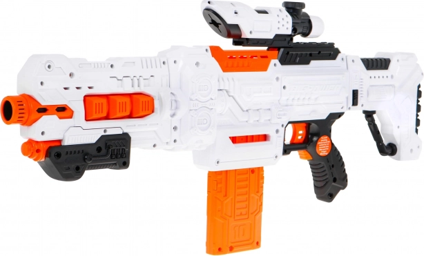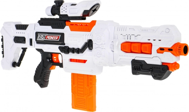 Der elektrische halbautomatische Blaster FAST PIONEER ist ideal für Hausgefechte und Präzisionstraining. Einfach das Magazin laden, den Netzschalter gedrückt halten, über das verstellbare Visier zielen und den Abzug drücken. Weiche Schaumstoffpfeile mit Gummispitze sind schonend und für sicheres Spielen geeignet.