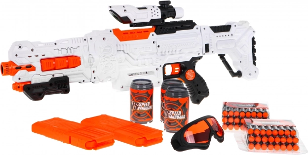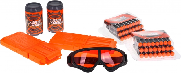 - Blaster, 2× Magazin, 48× Schaumstoffpfeil, 3× Zielscheibe (Dose), Schutzbrille