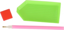 Eine grüne Sortierschale für die Steinchen, ein rosafarbenes Stiftwerkzeug und Klebewachs ermöglichen das schnelle und präzise Aufnehmen und Platzieren der Steinchen – ganz ohne unnötiges Durcheinander.