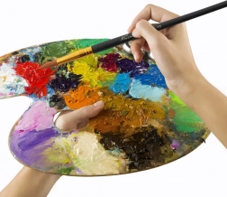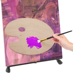 Die Holzpalette mit lebendigen Farben verleiht dem künstlerischen Prozess ein authentisches Gefühl.