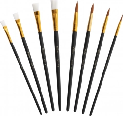 Enthält neun Pinsel mit schwarzen Holzgriffen und goldenen Metallzwingen, ideal für verschiedene Maltechniken.