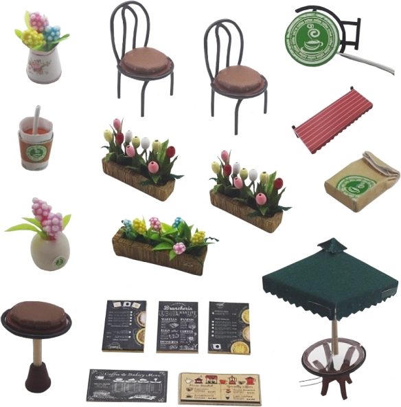 Von der Kaffeemaschine und der Vitrine mit Gebäck bis hin zu Tabletts, Getränken und Dekorationen – jedes Detail erhöht die Authentizität Ihres Modells.