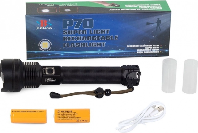 Taschenlampe P516‑P70, 2× 26650‑Akkus, USB‑Kabel, Originalverpackung