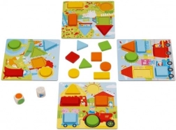 4 Bilder, 24 bunte Formen, 2 Würfel, Anleitung