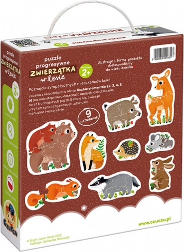 Dieses Set progressiver CzuCzu-Puzzles ist ideal als erstes mehrteiliges Puzzle für Kinder ab 2 Jahren. Der schrittweise ansteigende Schwierigkeitsgrad (2, 3, 4, 5 und 6 Teile) unterstützt die natürliche Entwicklung von Fähigkeiten und das Selbstvertrauen beim Puzzeln. Wunderschöne Illustrationen zeigen beliebte Waldtiere – von kleinen Mäusen bis zu Bären.