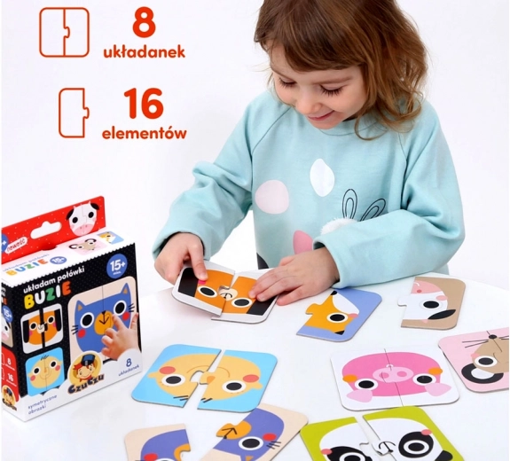 Die Aufgabe besteht darin, zwei Hälften des Löwen zu verbinden und ein vollständiges Bild zu erstellen. Diese großen Puzzles sind so konzipiert, dass sie dank ihrer präzisen Verarbeitung leicht zusammengefügt werden können, was dafür sorgt, dass die Teile nicht auseinanderfallen. Die bunten Illustrationen sind experimentell an die Altersgruppe der Kinder angepasst, was dazu beiträgt, ihre Sehkraft, motorischen Fähigkeiten und logisches Denken zu entwickeln.