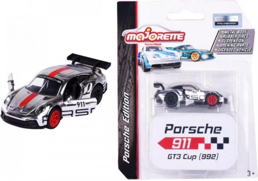 Metall-Sportwagen Porsche mit Freilauf, Gummireifen, zu öffnende Teile, inklusive Sammel-Metallbox. Maßstab 1:64, Länge 7,5 cm