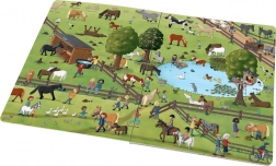 Dieses Bilderbuch für Kinder nimmt Sie mit auf einen ganzen Tag in die Welt der Pferde und Ponys. Sie blicken in das Leben auf dem Reiterhof, gehen auf einen Ausritt, fiebern bei Pferderennen mit und beobachten Hengste, Stuten und Fohlen auf der Weide. Auf jeder Doppelseite finden Sie wiederkehrende Figuren und Tiere, die Sie immer wieder neu entdecken können – die interaktive Suchaufgabe fördert Beobachtungsgabe, Konzentration und die Freude am Entdecken.