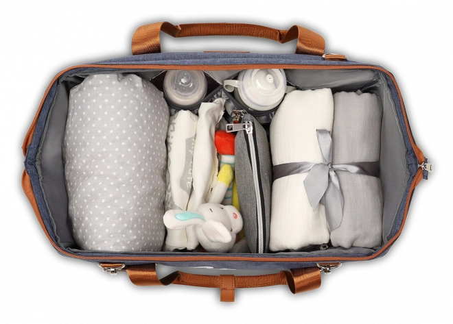 - Innen: große Reißverschlusstasche, große Klettverschlusstasche, 2 Thermotaschen mit beidseitiger Isolierung für Fläschchen, 2 innere Reißverschlusstaschen.