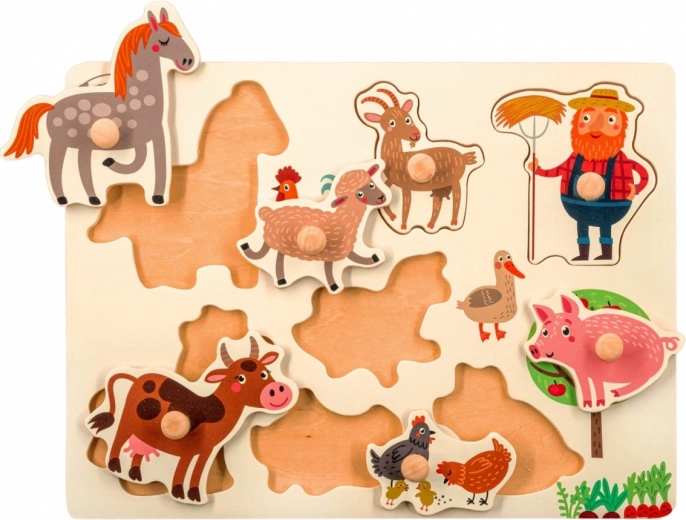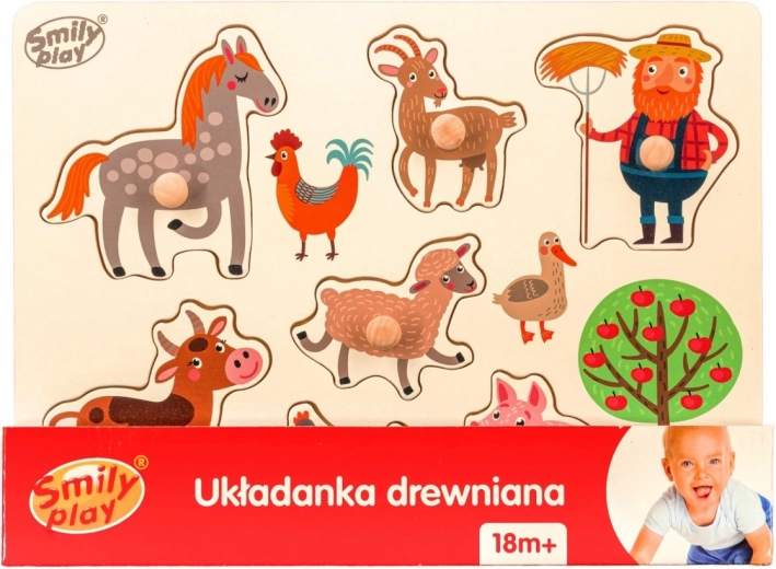 Dieses hochwertige Holzpuzzle enthält eine Grundplatte und sechs einzelne Teile mit Motiven von Bauernhoftieren. Jedes Teil hat einen ergonomischen Griff für eine bessere Handhabung und passt exakt an seinen vorgesehenen Platz. Das Spiel fördert auf unterhaltsame Weise die Hand-Auge-Koordination, die Feinmotorik sowie das visuelle Gedächtnis.