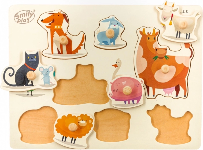 Das Puzzle kann auf speziell geformten Stellen auf einer angepassten Platte zusammengesetzt werden. Jedes Puzzleteil hat einen Griff, der Kindern das Zusammensetzen erleichtert.
