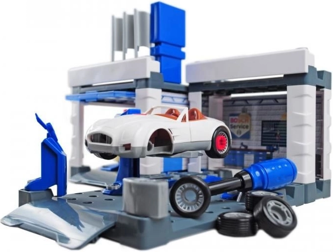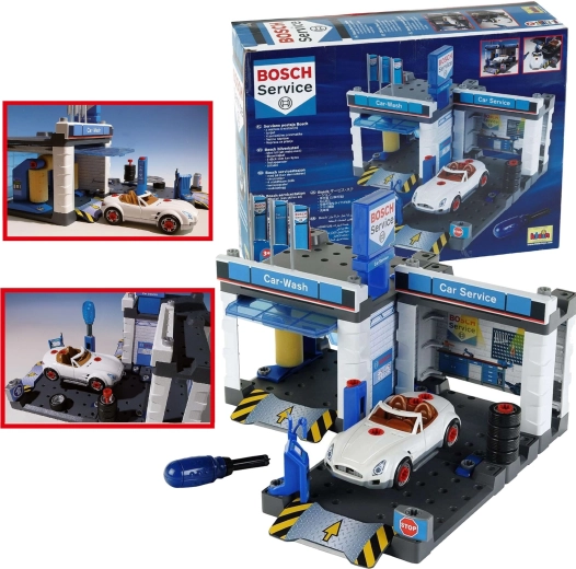 Diese Service-Station im BOSCH Service Design kombiniert Autowaschanlage, Servicebereich und Montagewerkstatt in einem. Enthalten ist ein weißes Cabrio, das Kinder mit dem beigelegten Schraubendreher auseinander- und wieder zusammenbauen können. Bewegliche Waschwalzen, eine Hebebühne und ein Servicepult mit „Computer“ sorgen für ein realistisches Spielerlebnis.