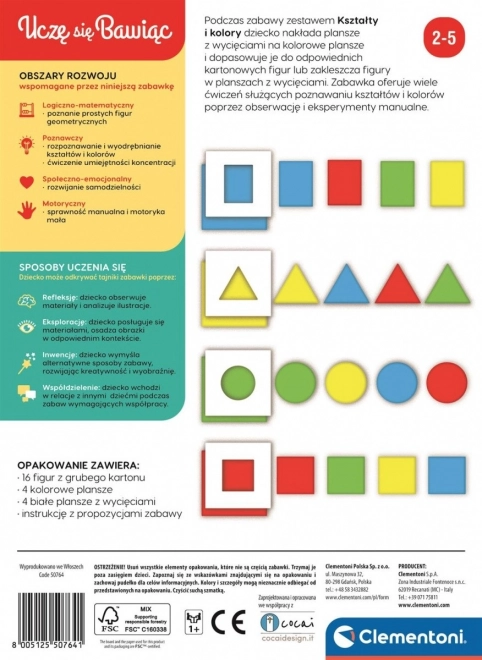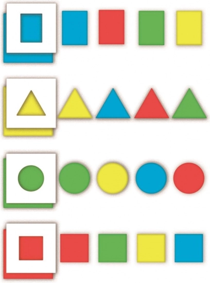 Beim Spielen mit dem Set Formen und Farben legt das Kind Ausstanzungen auf farbige Tafeln und ordnet sie den entsprechenden Pappfiguren zu oder steckt die Figuren in die Ausstanzungen. Das Spielzeug bietet viele Aufgaben zum Erkennen von Formen und Farben durch Beobachtung und praktisches Ausprobieren.