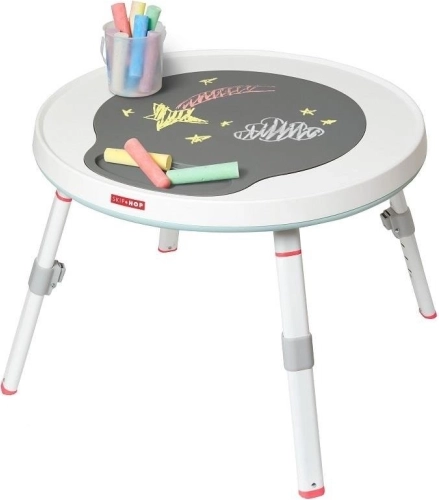 Aus dem Aktivitätszentrum wird im Handumdrehen ein interaktiver Tisch und später ein robuster Tisch mit Tafelfläche zum Malen und für kreative Spiele.