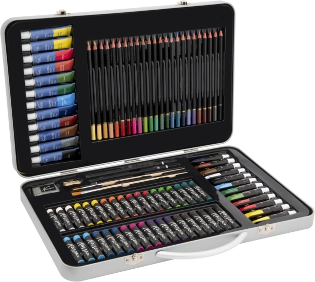 Eine großartige Wahl für Künstler, dieser Satz von Kunstbedarf ist in einem eleganten Blechkoffer verpackt, der alles enthält, was Sie für Ihre Kreativität unterwegs benötigen.