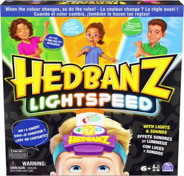 Genießen Sie das aufregende Spiel Hedbanz Lightspeed, bei dem sich die Regeln dank des dynamischen elektronischen Stirnbands mit drei Farben ständig ändern. Stellen Sie sich eine Szene vor, antworten Sie in Lichtgeschwindigkeit oder verwenden Sie drei Hinweise, je nach Farbe, die das Stirnband gerade zeigt.