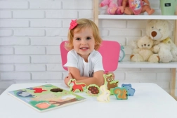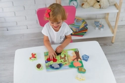 Dieses hochwertige Holzpuzzle mit Waldtiermotiv ist so gestaltet, dass es kleine Kinder mit Farben und Formen fasziniert und sie gleichzeitig sicher bei ihren ersten Entdeckungsschritten begleitet. Die stärkeren 3D-Teile liegen gut in der Hand und lassen sich leicht in die Aussparungen der Grundplatte einsetzen.
