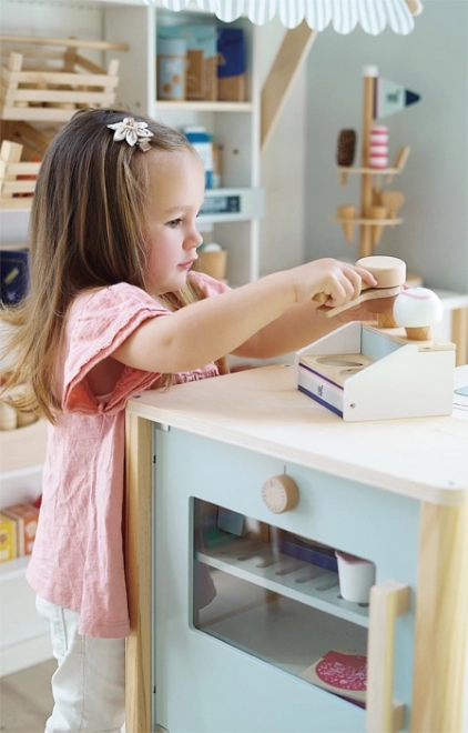 Die Holz-Eistheke SMALL FOOT Fresh bringt süßen Spielspaß in die Kinderküche. Zwei Fächer, Waffeln und Eiskugeln lassen sich dank Magneten leicht stapeln und halten sicher – so können Kinder Eis servieren wie in einer echten Eisdiele. Der magnetische Portionierer ermöglicht mit einem Knopfdruck das „Auflegen“ der Kugel auf die Waffel – einfach, spaßig und sehr effektvoll.