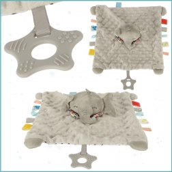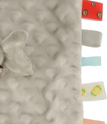 Das Spielzeug hat bunte Etiketten um den Rand, die die Aufmerksamkeit des Kindes anziehen und das Sehvermögen stimulieren. In den Ohren befindet sich eine raschelnde Füllung und im Kopf ein Glöckchen, das die Hörsinneswahrnehmung anregt.