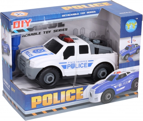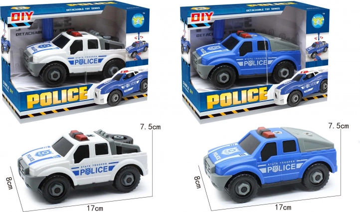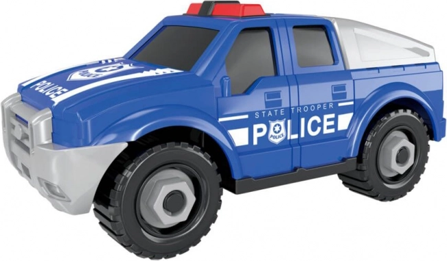 Unterhaltsames Bauset für Kinder: schraubbarer Polizei-Pick-up mit 17 cm Länge und frei drehenden Rädern. Im Set enthalten sind Fahrzeug und Kreuzschraubendreher mit praktischem Mutternschlüssel im Griff. Verfügbar in 2 Farbvarianten – Weiß und Blau.