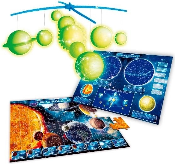 Set zum Bau eines echten Modells des Sonnensystems! Die Packung enthält aus fluoreszierendem Kunststoff gefertigte Planeten, die im Dunkeln leuchten, einen Arm zum Aufhängen der Planeten, ein großes Poster mit Sternbildern, ein Sonnensystem-Puzzle und eine Anleitung.