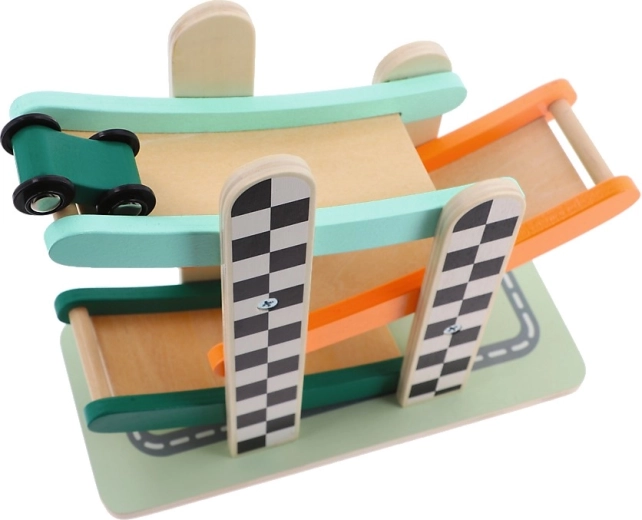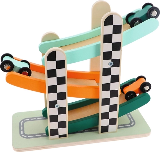 Dreistöckige Holzrutsche mit kleinen Autos.