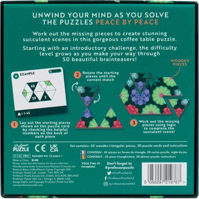 Entspannen Sie Ihren Geist mit dem Logikspiel Peace by Peace: Sukkulenten, das schönes Design mit cleveren Herausforderungen verbindet. Setzen Sie Bilder von Sukkulenten aus hölzernen Dreiecken zusammen, arbeiten Sie sich durch 50 Aufgaben und trainieren Sie Ihre Vorstellungskraft sowie Konzentration. Enthält 45 hölzerne dreieckige Teile, 50 Anweisungskarten und einzigartige Muster-Puzzles für Spaß bei Kindern und Erwachsenen.