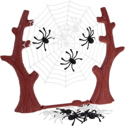 - 4 große weiße Spinnen, 4 große schwarze Spinnen, 4 kleine weiße Spinnen, 4 kleine schwarze Spinnen, 2 Baumstämme, Verbindungsklammer, Spinnennetz, Anleitung