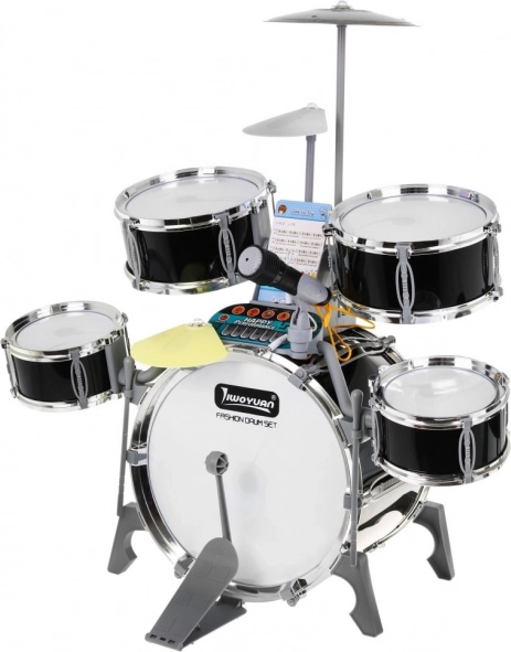 Das multifunktionale Kinder-Schlagzeugset enthält 5 Trommeln, 2 elektronische Becken (aus Kunststoff) und ein Metallbecken, Bedienfeld, Mikrofon, 2 Sticks und 6 Notenkarten für die einfache Erlernung des Spiels. Das Set wird durch drei AA-Batterien oder ein USB-Kabel betrieben.