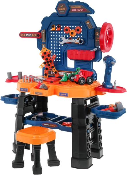 Dieses farbenfrohe Werkstattset verwandelt das Kinderzimmer in eine echte Mini-Werkstatt. Die robuste Werkbank mit Ablagen und Organizer wird durch einen bequemen Hocker und eine batteriebetriebene Akku-Bohrmaschine (2× AA, nicht enthalten) ergänzt. Kinder können schrauben, bohren und eigene Projekte bauen, einschließlich zwei Baufahrzeugen – Radlader und Kipper.