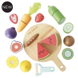Dieses hochwertige Set für kleine Köchinnen und Köche bietet realitätsnahes Spiel voller Fantasie. Es enthält ein natürliches Holz-Schneidebrett, einen Schäler, ein Messer und eine Auswahl appetitlich aussehender Lebensmittel, die sich mithilfe des Klettverschlusses leicht „aufschneiden“ und wieder zusammenfügen lassen. Ideal zur Förderung von Koordinationsfähigkeiten, der Feinmotorik sowie für Rollenspiele.