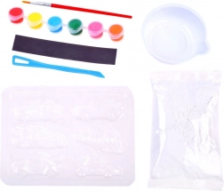 Das Set enthält Gips, Schüssel, Rührstäbchen, 6 Farben, Pinsel, Magnetband und Anleitung – einfach Wasser hinzufügen und schon kann es losgehen.
