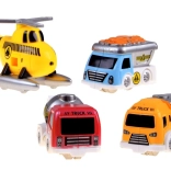 Enthalten sind drei Baufahrzeuge – Kipper, Betonmischer, Tankwagen – sowie ein Hubschrauber. Außerdem eine Bauarbeiterfigur für noch realistischeres Spiel.