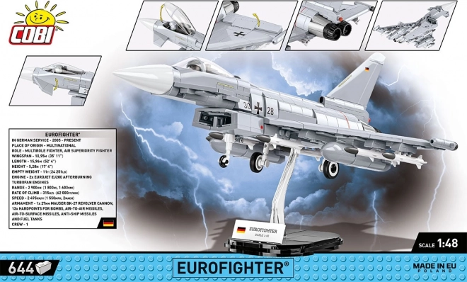 Enthalten ist ein stabiler Ausstellungsständer mit der Bezeichnung „Eurofighter“, ideal für Regal oder Vitrine.