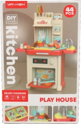 Die Küche ist aus hochwertigem Kunststoff gefertigt, was Langlebigkeit und Sicherheit beim Spielen garantiert. Dank der 44 beigefügten Elemente, einschließlich Geschirr und Lebensmittel, können Kinder authentische kulinarische Erlebnisse schaffen. Die Küche wird mit 3 AA-Batterien betrieben (nicht im Lieferumfang enthalten).