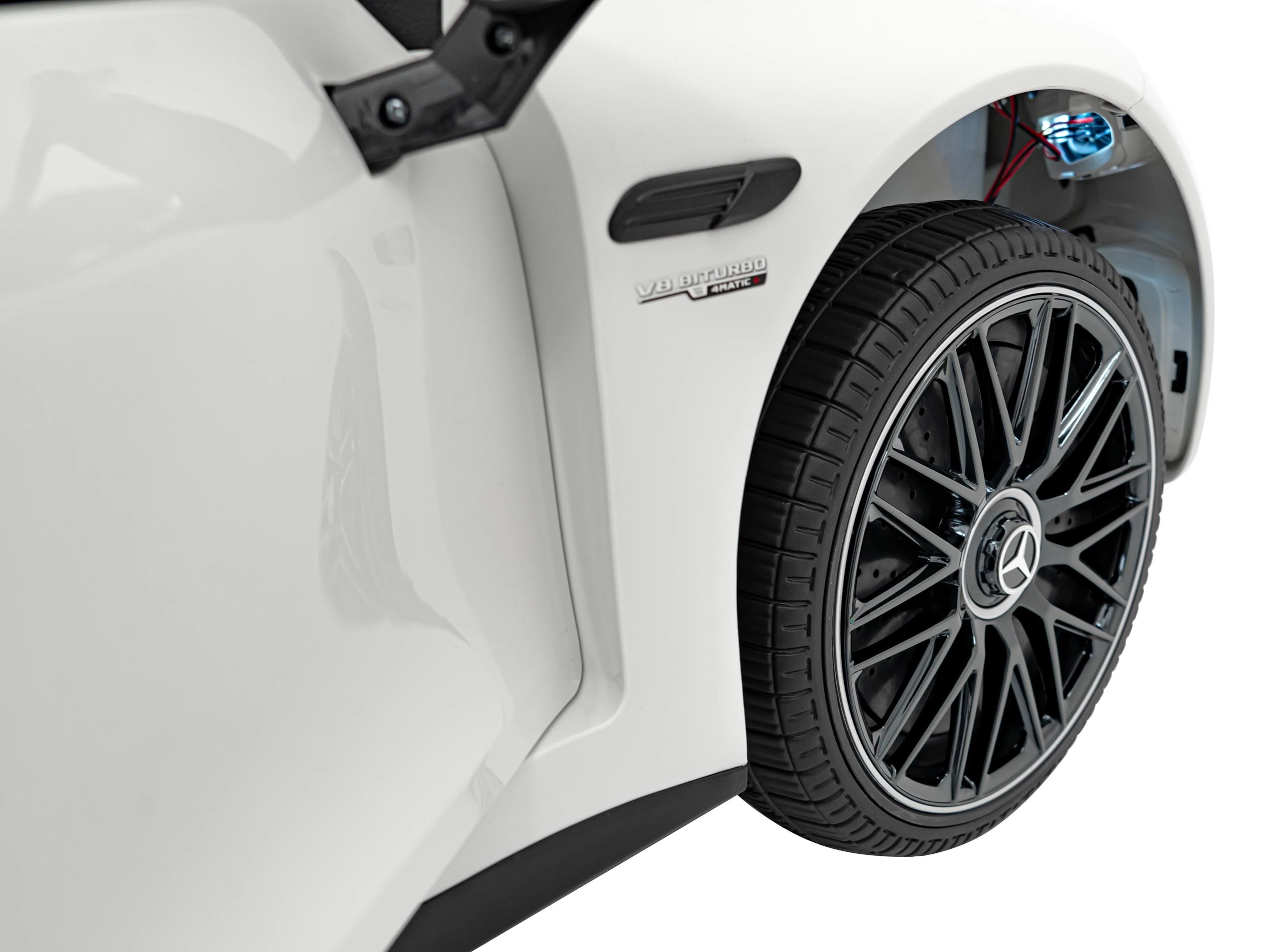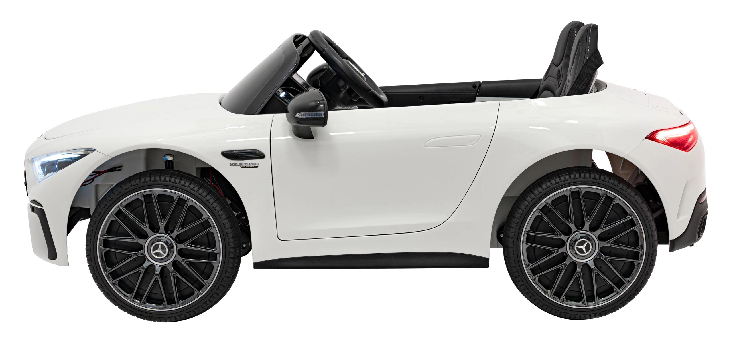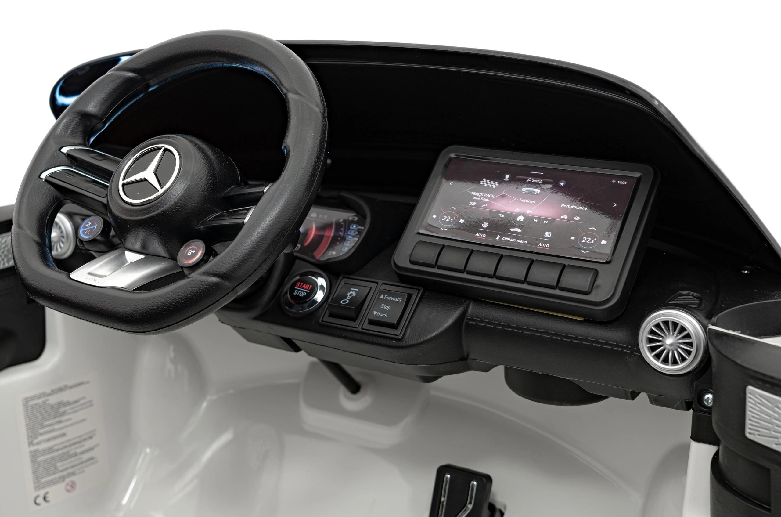 Realistische Details wie öffnende Türen, Starttaste mit Motorstart‑Sound, leuchtende LED‑Scheinwerfer vorn und hinten und hochwertige AMG‑Elemente begeistern kleine Fahrer und ihre Eltern. Das Multimedia‑Panel bietet MP3, USB, AUX, Bluetooth und FM‑Radio, hinzu kommen Sounds am Lenkrad und eine Ladezustandsanzeige.