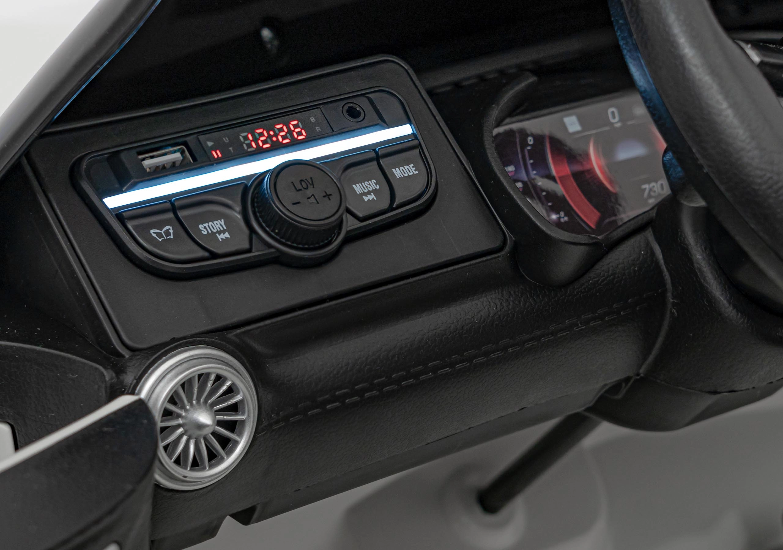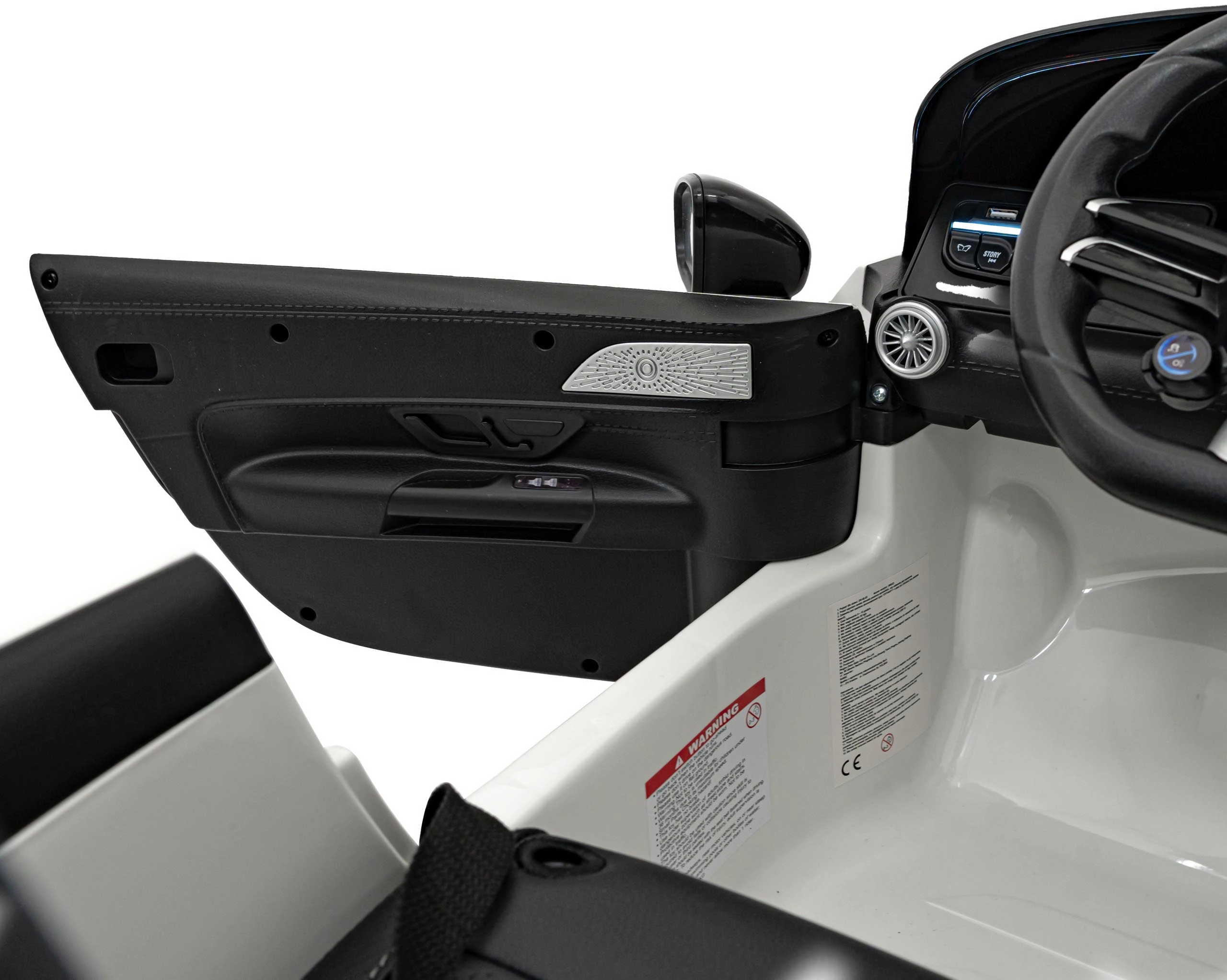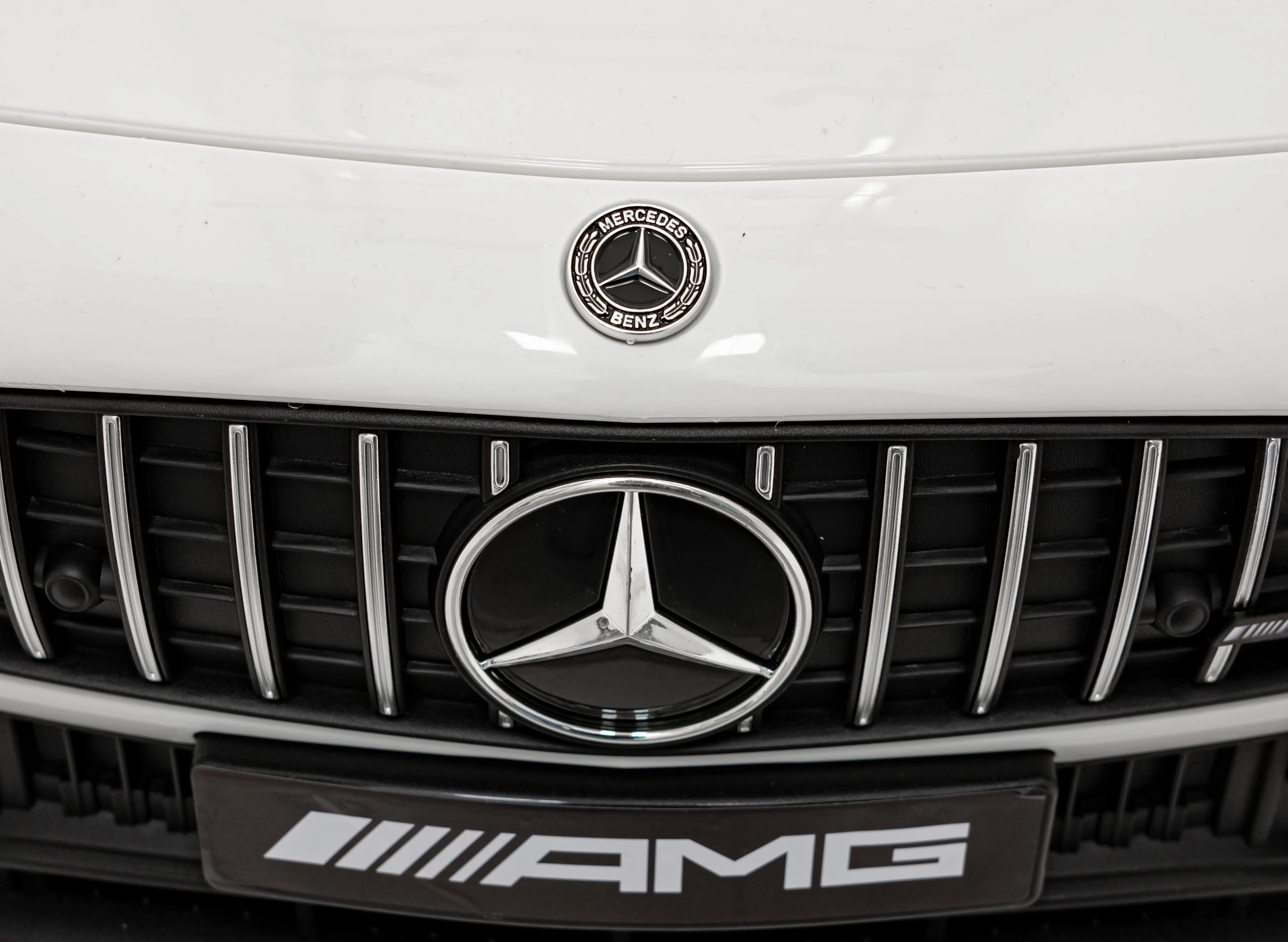 Realistische Details wie öffnende Türen, Starttaste mit Motorstart‑Sound, leuchtende LED‑Scheinwerfer vorn und hinten und hochwertige AMG‑Elemente begeistern kleine Fahrer und ihre Eltern. Das Multimedia‑Panel bietet MP3, USB, AUX, Bluetooth und FM‑Radio, hinzu kommen Sounds am Lenkrad und eine Ladezustandsanzeige.