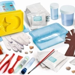 Inhalt des Sets: Form, Unterlage für das Papiermodell, spezielle saugfähige Papiere, Schutzhandschuhe, Behälter mit 100-ml-Verschluss, Behälter mit 50-ml-Verschluss, Pinzette, Spatel, Pipette, Farbstoffe, Kunststoffschale, Kristallbehälter, Gesteinsproben, Pinsel, Sicherheitsverschluss für Reagenzgläser, Reagenzglas mit Deckel, Beutel mit Aluminium- und Kaliumsulfat, Beutel mit Gips, Beutel mit Kaliumdihydrogenphosphat, Beutel mit Ammoniumdihydrogenphosphat, Reagenzglas mit Strontiumaluminat, illustrierte Anleitung (CZ, SK, PL, HU).