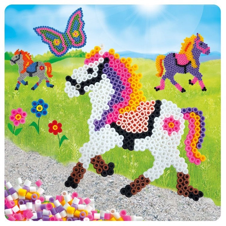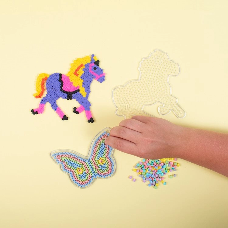 Lege die farbigen Perlen auf die beiliegende Plastikplatte. Sobald alle Perlen an ihrem Platz sind, bitte Mama oder Papa um Hilfe – gemeinsam könnt ihr das Bild fixieren.