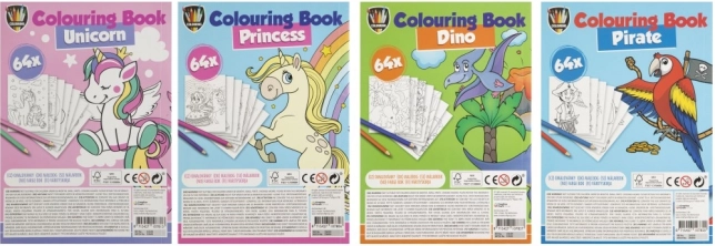 Malbuch A5 mit 64 Bildern: Einhorn, Prinzessinnen, Dino und Piraten. Fördern Sie die Kreativität und Fantasie der Kinder.