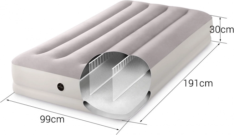 Praktische aufblasbare Matratze der Marke INTEX mit den Maßen 191 × 99 × 30 cm für erholsamen Schlaf einer Person zu Hause oder unterwegs. Dank der Dura-Beam Fiber-Technologie ist sie stabil und bi... Mehr anzeigen