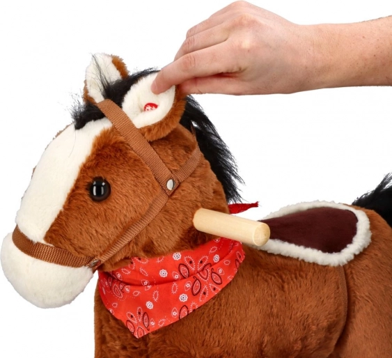 Das braune Schaukelpferd mit weicher Plüschoberfläche, Sattel und dekorativem Halstuch ist der ideale Begleiter für den Alltag. Dank der stabilen Holz-Wippe kann das Kind sicher schaukeln, die Motorik fördern und die Koordination üben.