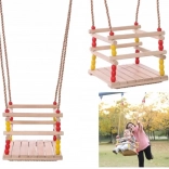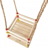 Diese Holzschaukel mit einem Sitz von 30 × 30 cm und vorderem Sicherheitsbügel ist für kleine Kinder konzipiert. Dank glatt geschliffenem Holz ist das Sitzen bequem und angenehm anzufassen. Nach entsprechender Imprägnierung eignet sie sich für Innen- und Außenbereich – Sie hängen sie an einen Baum, eine Pergola oder eine freistehende Konstruktion.