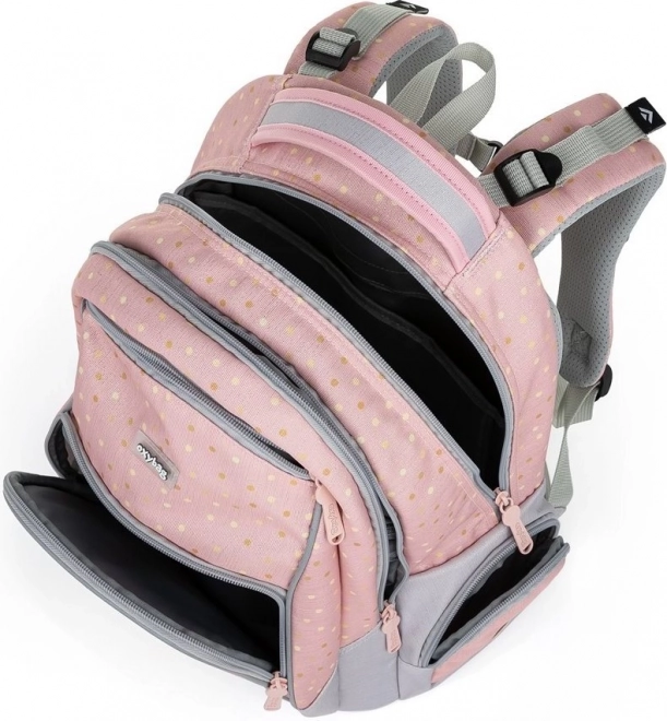Der Schulrucksack OXY GO im zarten Design mit Schmetterlingsmotiv überzeugt nicht nur optisch, sondern auch durch durchdachte Ergonomie. Dank des atmungsaktiven Rückenteils und der verstellbaren Schultergurte bietet er ganztägigen Tragekomfort und unterstützt eine korrekte Körperhaltung. Das geringe Gewicht von 0,99 kg und Reflexelemente erhöhen die Sicherheit auf dem Schulweg.