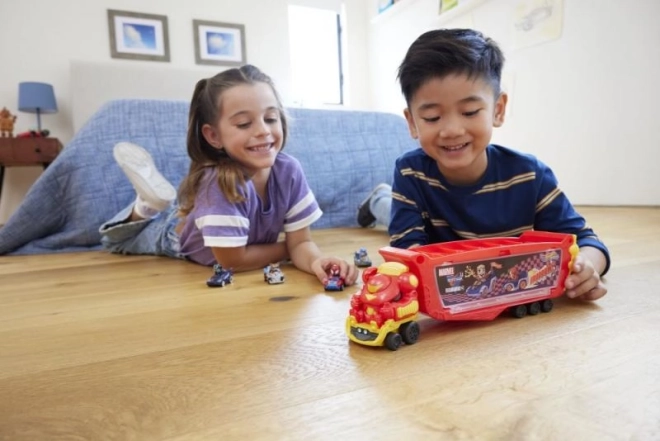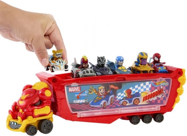 Kinder können die vordere Kabine abkoppeln und separat damit spielen. Hebt man den Helm an, wird eine nicht abnehmbare Tony-Stark-Figur auf dem Fahrersitz sichtbar – perfekt für Geschichten und kreatives Spiel. Der Transporter fasst bis zu 10 Autos der Hot Wheels RacerVerse Reihe oder Standard-Hot-Wheels-Modelle im Maßstab 1:64.