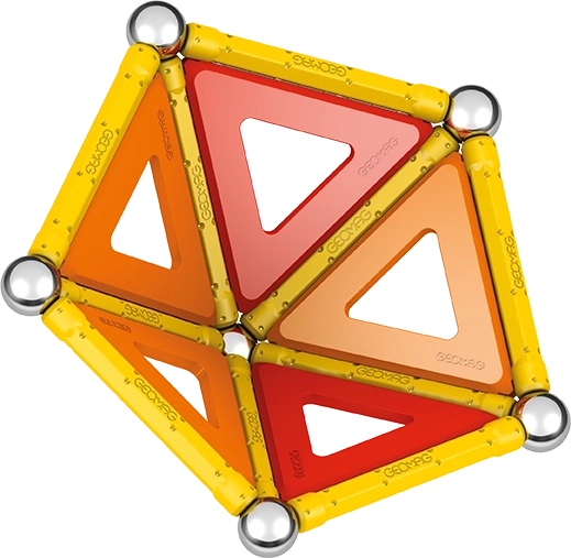 Lieferumfang: 12 gelbe Magnetstäbe, 12 Stahlkugeln, 8 dreieckige Paneele, 2 quadratische Paneele, 1 orangefarbenes Paneel in Fünfeck-Form sowie eine Kunststoffbox für Kugeln und Stäbchen.