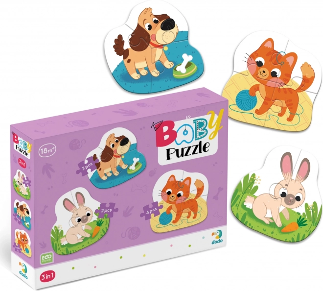 Entdecken Sie die ersten Puzzles für die Kleinsten: Das Set DODO Baby Puzzle Haustiere 3-in-1 bietet drei Kontur-Bilder mit unterschiedlichem Schwierigkeitsgrad (2, 3 und 4 Teile). Perfekt zur Förderung der Feinmotorik, des logischen Denkens und der Hand-Auge-Koordination – und es bringt zugleich Freude mit beliebten Haustiermotiven.