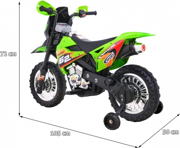 Die praktische Konstruktion mit Kunststoffrädern und Gummilaufstreifen erhöht Komfort und Haftung. Der bequeme Sitz (34 × 14 cm), die sichere Bodenfreiheit (13 cm) und die kompakten Abmessungen 105 × 50 × 72 cm machen das Motorrad zum perfekten Gefährt für den täglichen Spielspaß. Im Lieferumfang ist alles enthalten: Anleitung, Ladegerät und anschraubbare Stützräder.